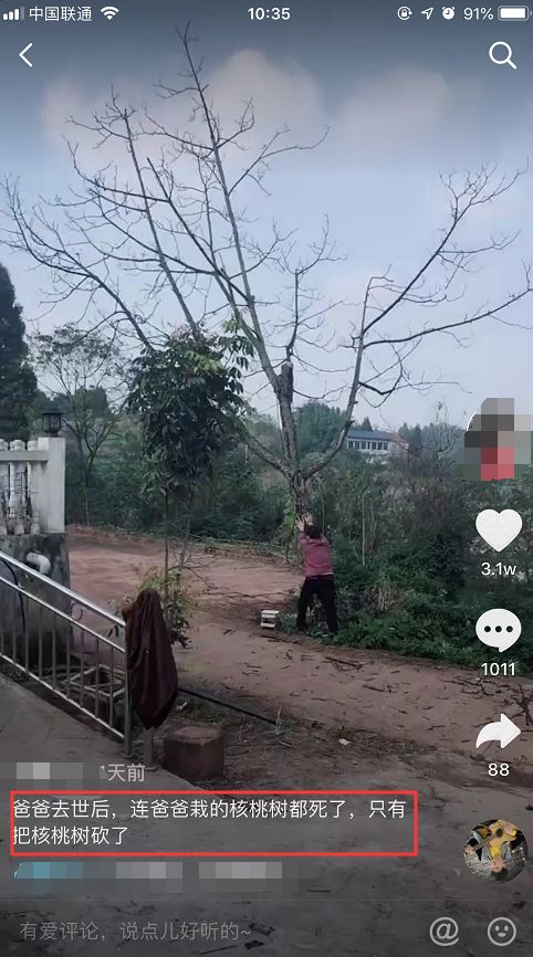 就像是我昨天在抖音上刷到的一个视频,说父亲死了,父亲悉心栽养的核桃树也死了,并且这个视频下面还有很多的评论,说自己那边也有这种说法,不能有很多人评论,点赞的也不少。。。。。。。