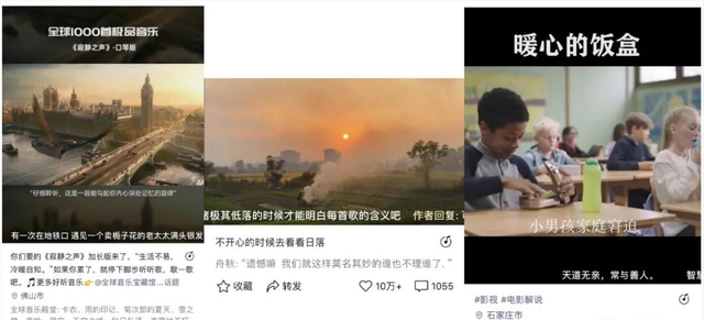 相信大家在日常刷视频号时候,时常会刷到上面说到的那些影视解说、热门音乐、鸡汤情感文、商业思维励志文、健康养生文、读书学习文等等内容的账号。