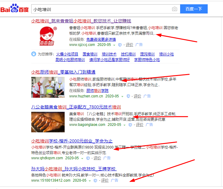 百度直接搜一个竞价单页,看看小吃培训的价格: