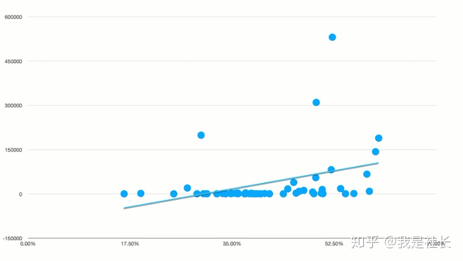 散点图的关系相当漂亮,严格在一条斜线附近,说明热门视频的播放量与推荐指数的关系非常明确。